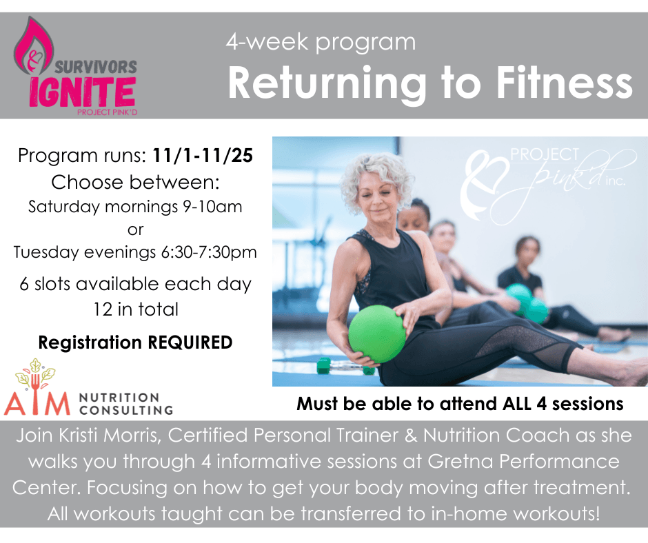 Join our 4-week introductory fitness class, tailored specifically for breast cancer survivors. Meeting once a week, each session teaches gentle, recovery-focused exercises that enhance strength, mobility, and overall well-being. With a focus on techniques that easily translate into home workouts, you'll gain the tools and confidence to continue your fitness journey long after the course ends, all in a supportive, empowering environment.